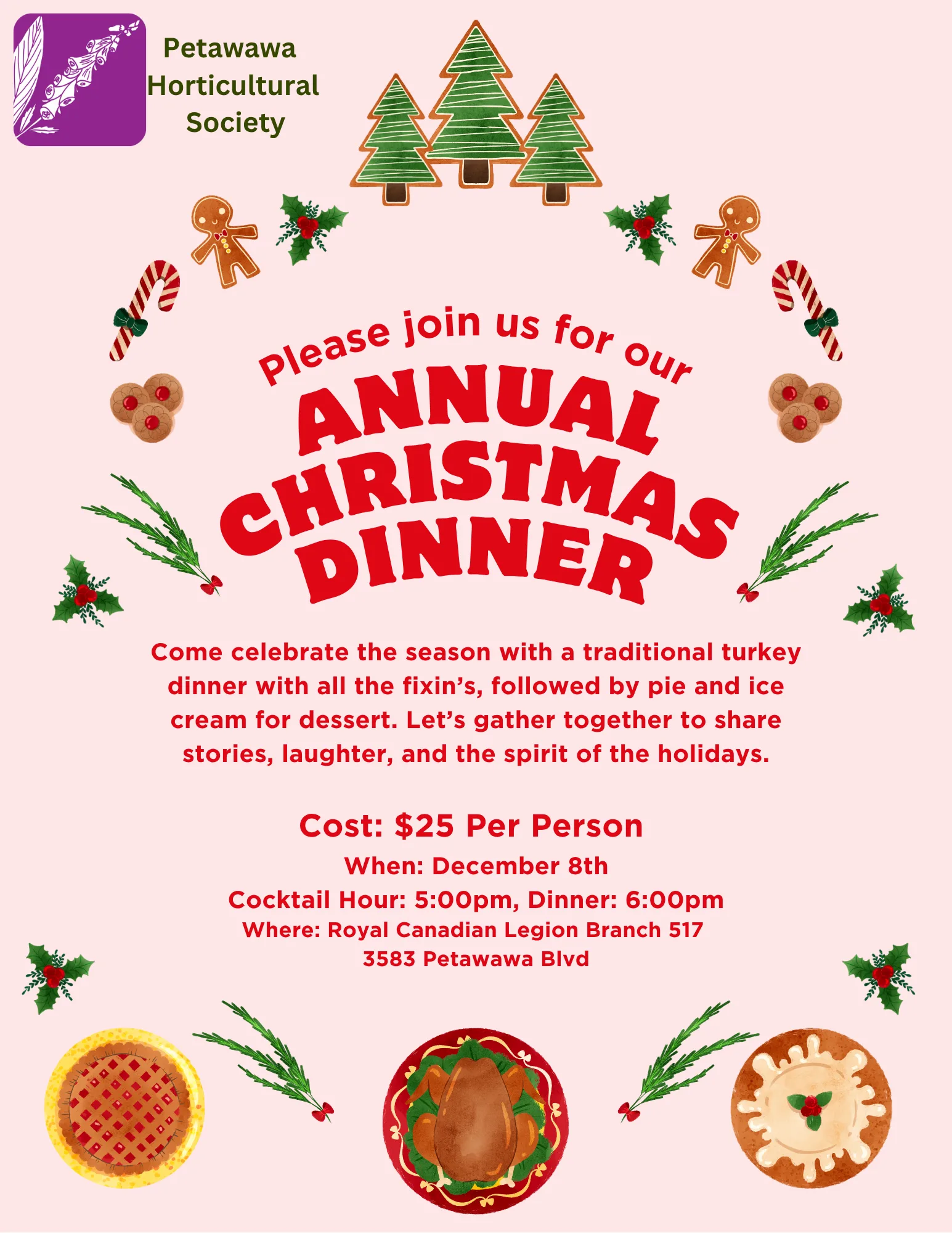 Petawawa Legion 3583 Petawawa Blvd, Petawawa, Ontario, CanadaCome celebrate the season with a traditional turkey dinner with all the fixin’s, lovingly prepared by the Ladies Auxiliary, and topped off with pie and ice cream for dessert.