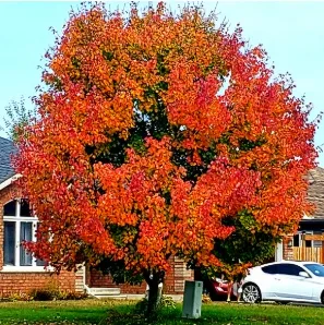 Leaves: 7-13 cm (3-5 in) green with right angles toothed edges. Female trees produce yellow-orange leaves in fall and males orange to scarlet.